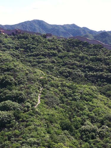 Throughout that time, the BIFF has been transformed into an ecosystem that helps prevent damaging windstorms, stabilizes the soil and purifies the air, earning it the designation of a “State-level Key Public Welfare Forest Protection Area” from the Beijing government in 2004. It covers an area of 133 hectares (about 328 acres), with an altitude ranging from 630 to 800 meters, and boasts 16 types of flowering shrubs, such as Chinese pines, arborvitaes and apricot trees. The trails around the BIFF feature signs telling the history and culture of the Great Wall and help educate visitors about the crucial importance of environmental conservation.